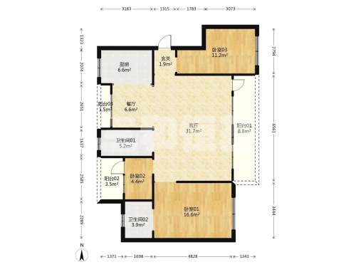 房屋戶型: 3 室2廳 1 廚2衛(wèi)